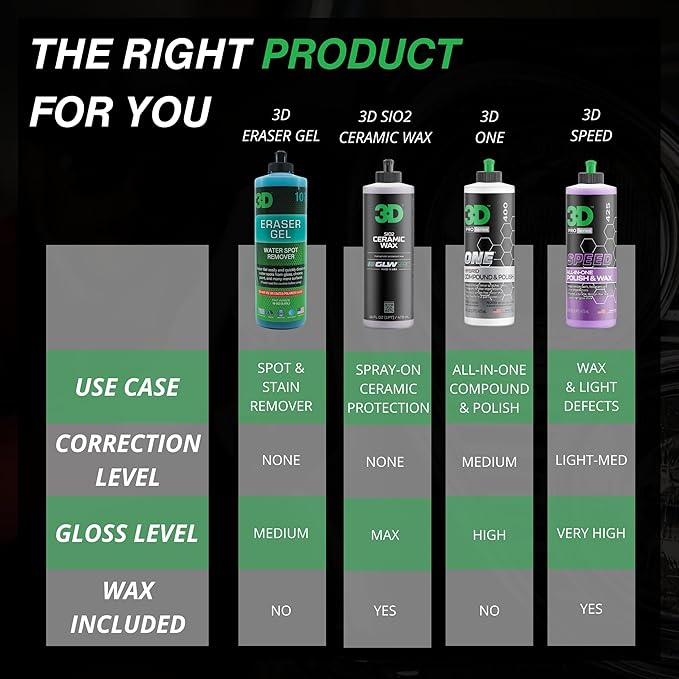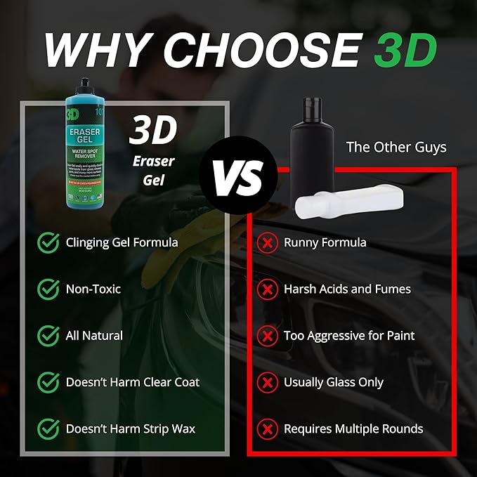 - Perfect for DIY Detailers and Pros: Whether you're in your driveway or working in a pro shop, 3D Eraser Gel makes water spot removal easier and faster. Skip expensive services and do it right at home—no special tools needed. Just follow the instructions and enjoy pro-level results