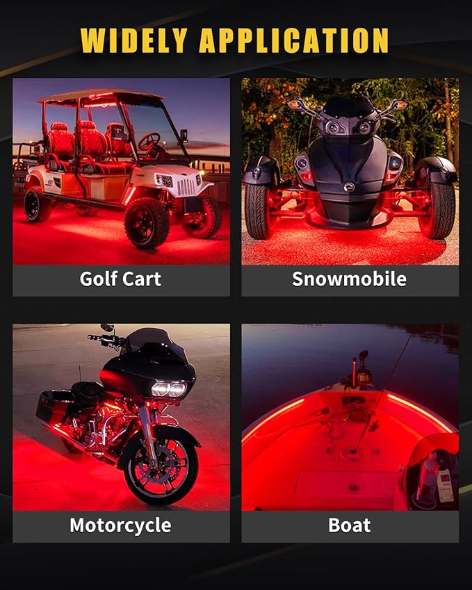 - 【Extensive Application】Used for Car Truck Motorcycles Boat Auto Led Atmosphere decoration light Strip for footwell,front grille,rear trunk,under car body,underglow,under dash lighting,also used for home cabinet floor light Decoration Steady Light indoor outdoor Party decoration strip light.