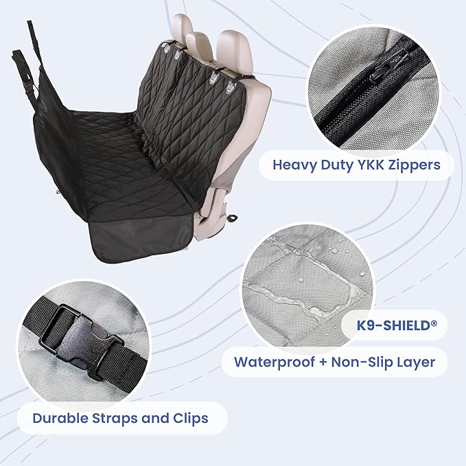 - ADVANCED WATERPROOF PROTECTION: Featuring exclusive K9-Shield waterproof technology, this dog hammock for trucks and large SUVs protects your car from spills, dirt, and drool. The non-slip backing keeps the cover securely in place, even with active pets. Please note that the seams are not watertight, but it provides reliable protection.