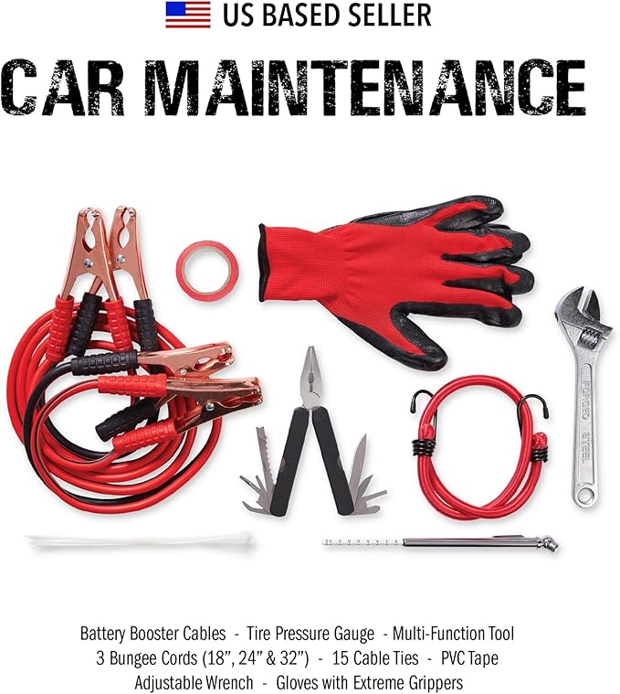 - LIFE-SAVING JUMPER CABLES: Featuring 8-gauge copper jumper cables, this Adult emergency tool kit for cars will help get your it working again in a flash if you ever need a boost, whether in the summer or winter.