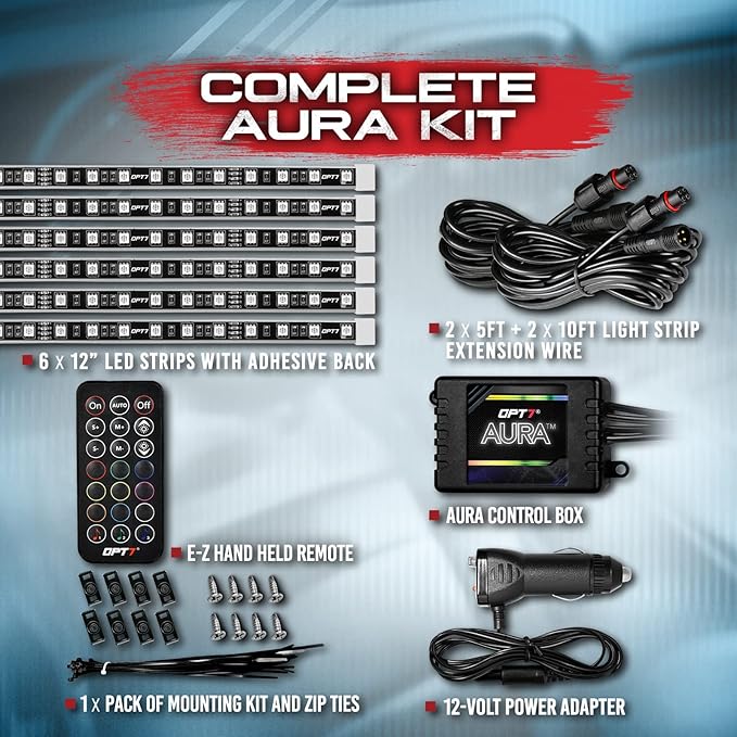 - Set the Ambience: Gather the attention of others with the OPT7 Aura Interior LED light strips! These LED strips are the best for your vehicle, featuring plenty of brightness and a wireless remote (Cycle, Strobe, Color Fade, Dimmers).