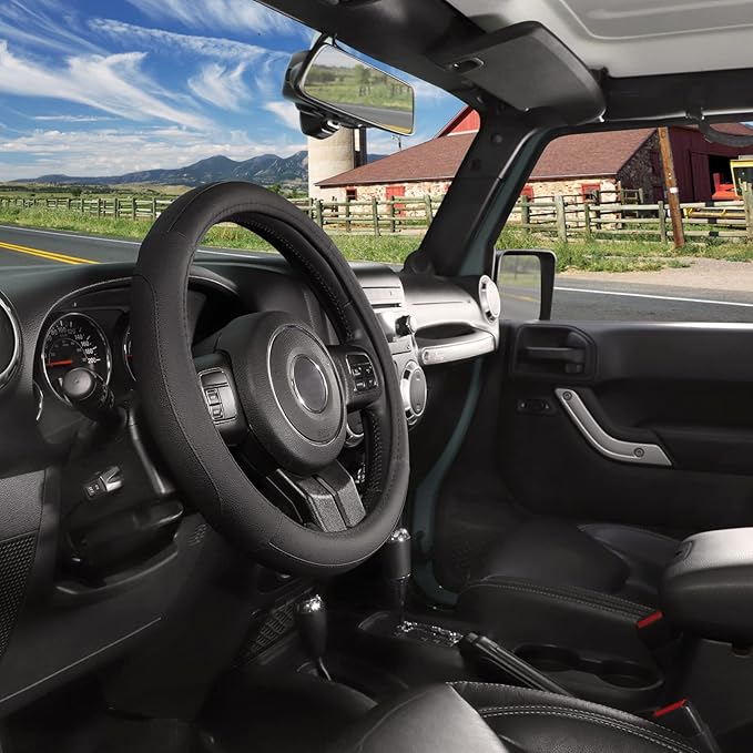 - NO MORE STICKY: The auto steering wheel cover is comfy to hold, it absorbs the hand-sweat that the summer heat causes, and allows you to grip the steering wheel much better.