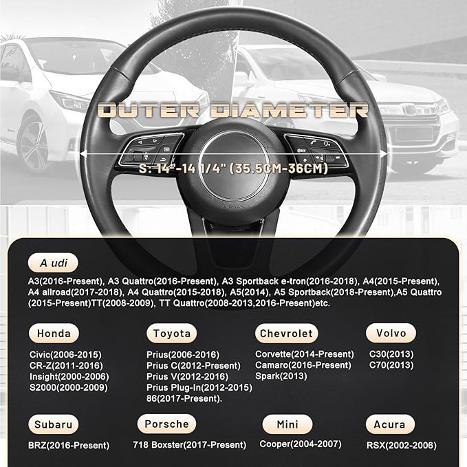 - READY TO INSTALL: Warm up the steering cover, and slip it on your steering wheel. Installation is fairly easy, any adult can install this steering wheel cover. Suitable for small size steering wheels with outer diameter of 14-14 1/4 inches, please carefully measure the size of your steering wheel before purchasing.