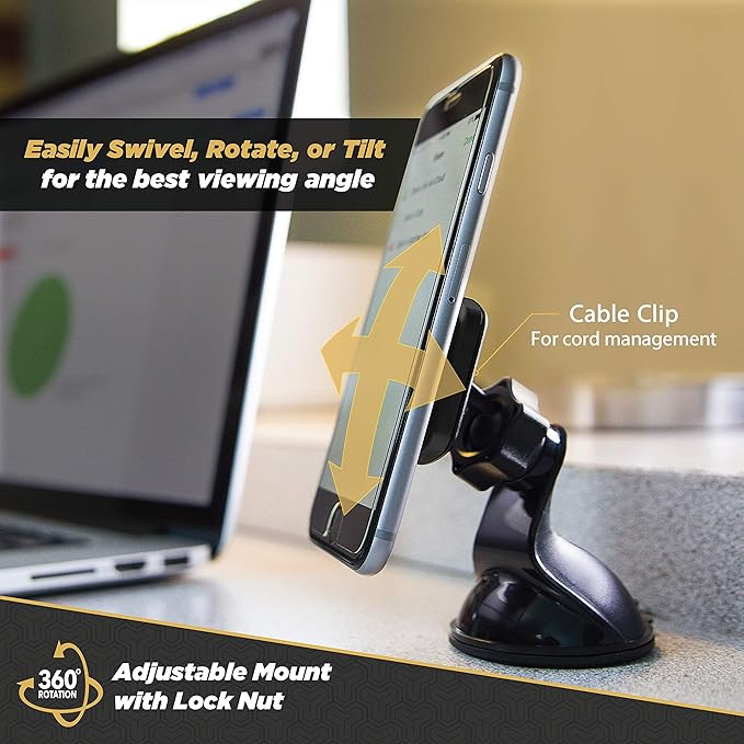 - Suction Phone Holder - Safely and quickly secure any mobile device in your car to a dashboard, windshield or any firm & flat surface. With a StickGrip suction cup base, this phone car mount will stick to any surface and not fall off while driving.