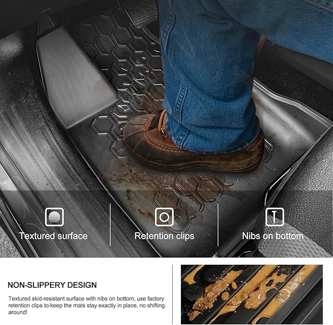 - Non-Slippery & Easy To Clean: Just yank it out and clean it off with a hose then carry on like new, the mats work with factory fasteners, the anti-shift nibs on the back of the mats grip the carpet and help hold your mats in place