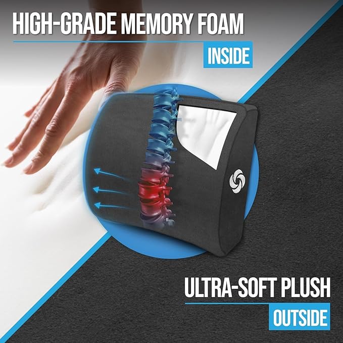- CONTOURED FOR COMFORT - This lumbar support cushion is more than just a flat rectangle filled with comfortable material. Its shape is contoured to align with the lumbar region and offer the most support and strain relief possible at key points along the lower back. The optimized shape of this cushion combines with its plush exterior and its high-grade memory foam interior to offer a strain relief experience that other lumbar support cushions are hard-pressed to match.