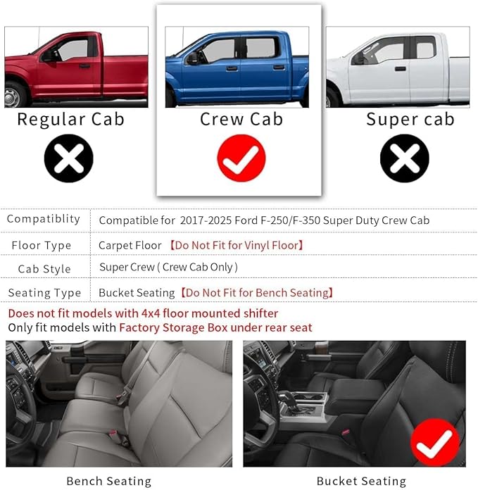 - : Vehicle Service Type Compatible for 2017-2025 Ford F-250/F-350, Only fits Crew cab (4 full size doors) with front row bucket seats and factory box under rear seat Compatible for 2017-2025 Ford F-250/F-350, Only fits Crew cab (4 full size doors) with front row bucket seat… See more