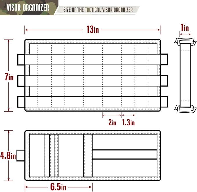 - Adjustable MOLLE Panel : Revolutionize your storage with visor organizer featuring a hybrid MOLLE panel. It combines 0.8" & 1.6" elastic and un-elastic loop webbing slots. 2 detachable elastic straps create custom compartments on-the-road, securing everything from tiny tools to more large flashlights with perfect precision.