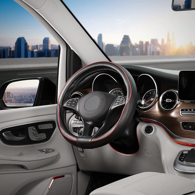 SEG Direct Car Steering Wheel Cover Universal Standard Size 14 1/2"-15" Leather with Carbon Fiber Pattern Black and Red
