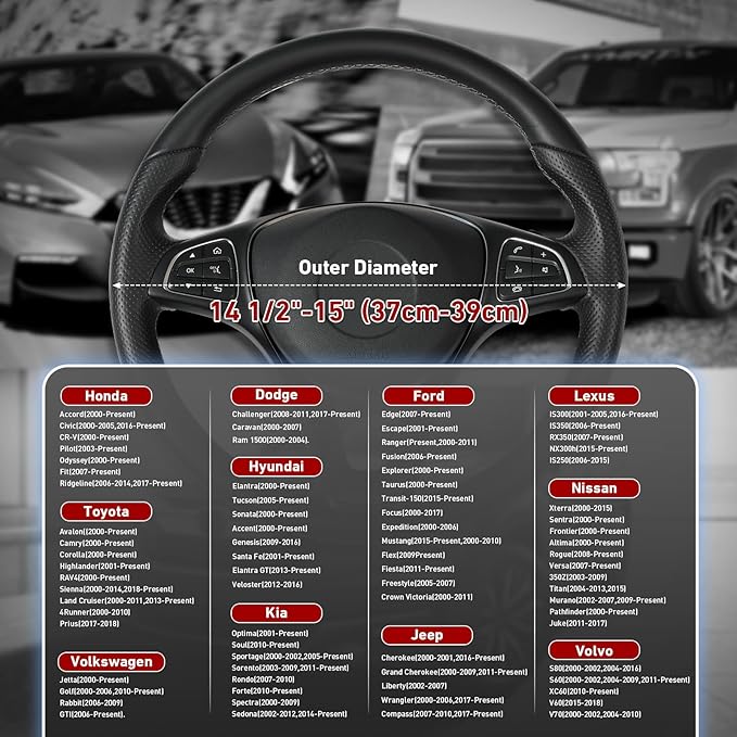 - 【Ready to Install】Simply warm up the steering cover for munites, and slip it on your steering wheel. Installation is fairly easy, any adult can install this steering wheel cover. Suitable for standard size steering wheels with outer diameter of 14 1/2 - 15 inches.