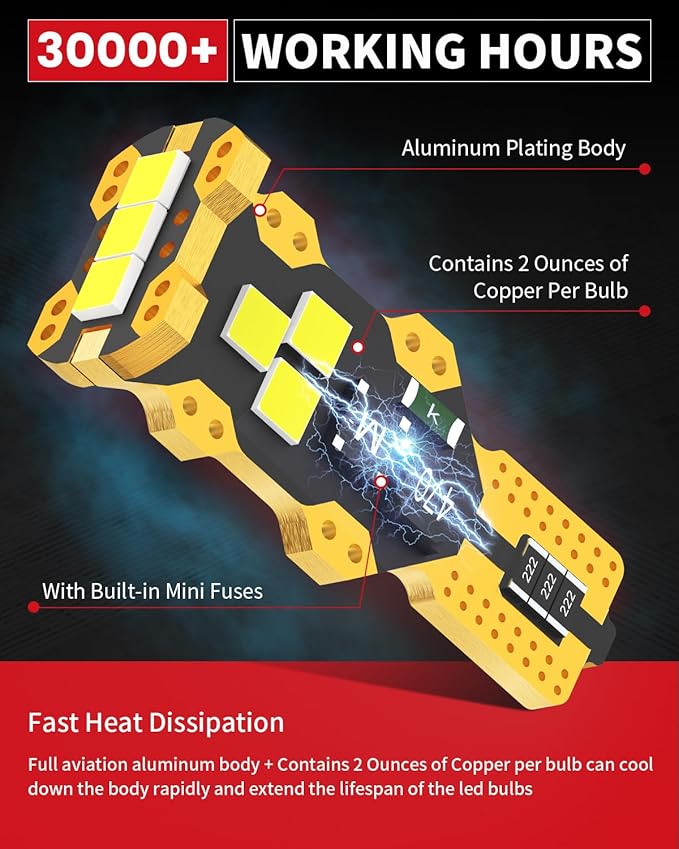 - 【Safe Driving】Loaded with mini fuses to prevent 912 led bulb from burning out by the excessive instant current to ensure safer installation. Efficient heat dissipation make sure the T15 led bulb will work 30,000 hours. 3 Luminous Points Design, with similar beam pattern to halogen to provide safe driving.
