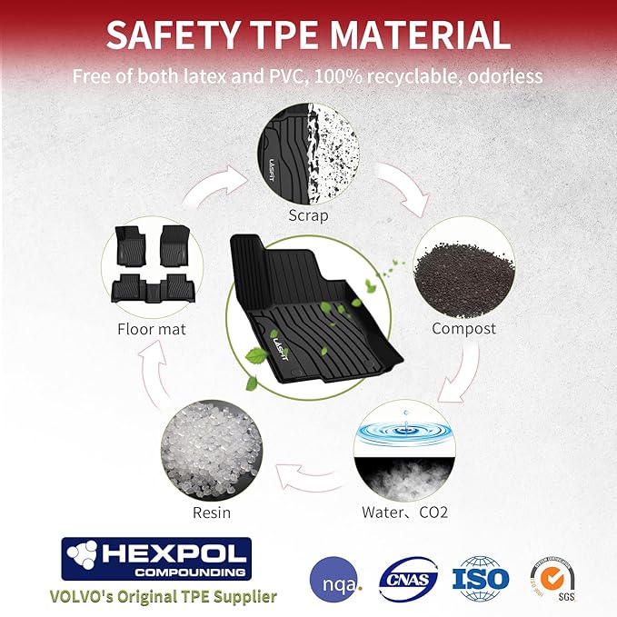 - Premium TPE Material : LASFIT floor mats made of 100% brand new TPE material (Thermoplastic Elastomer) for a comfortable and soft touch and exquisite finish. More friendly to the elderly, children and pets. Exclusively designed anti-slip studs for more safety and shock and sound absorbent.