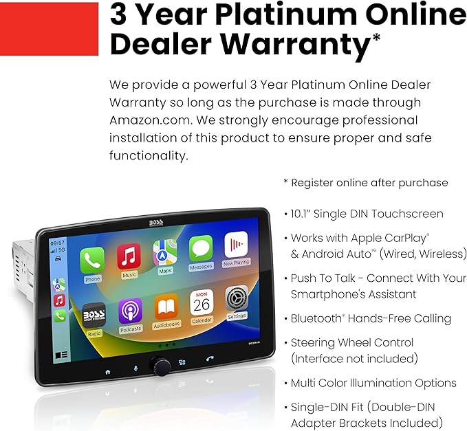 - WARRANTY: BOSS Audio Systems provides a powerful 3-year platinum online dealer warranty. We strongly encourage professional installation of this product to ensure proper and safe functionality