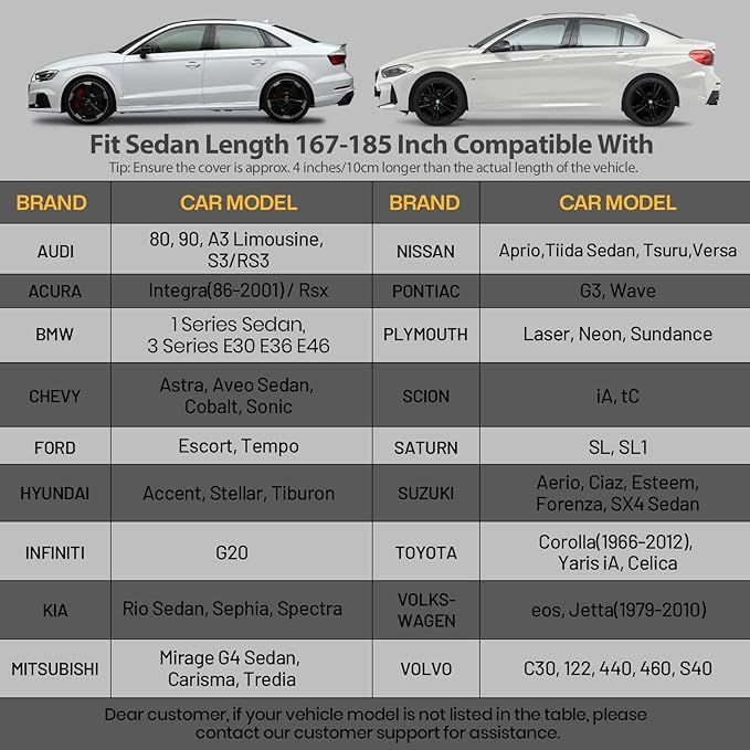 - 【Choose the Right Size】 - Favoto full car cover is suitable for 167 inches to 185 inches (4.25 to 4.7m) long sedans. (Suitable for Audi A3/S3/RS3, Honda Civic, Kia Rio, Volvo C30, Hyundai Accent, Chevrolet Aveo) Package includes a storage bag, you can easily fold the cover and carry with you in the trunk.