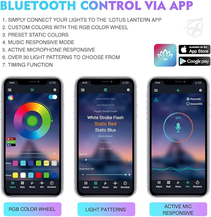 - 【3 Ways to Control】:With efficient bluetooth connect your APP both Android and Iphone,you can customize light effects and access 16 million RGB colors or you can just select your ideal colour with your finger by wireless remote,the control box