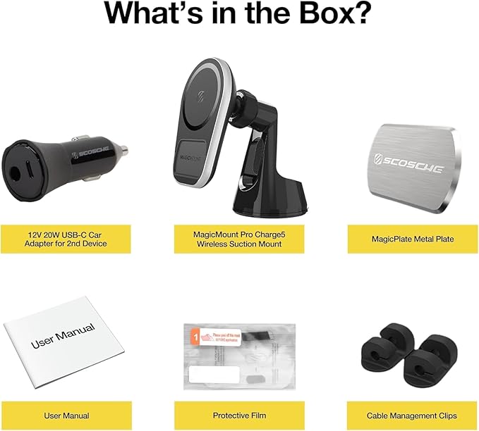- Included Components : (2) Cable Management Clips, Alcohol Cleaning Wipe, Car Adatper with Bonus 20W USB-C port, MagicMount Pro Charge5 Windhsield/Dashboard Mount, MagicPlate (2) Cable Management Clips, Alcohol Cleaning Wipe, Car Adatper with Bonus 20W USB-C port, MagicMount Pro Charge5 Windhsield/Dashboard Mount, MagicPlate