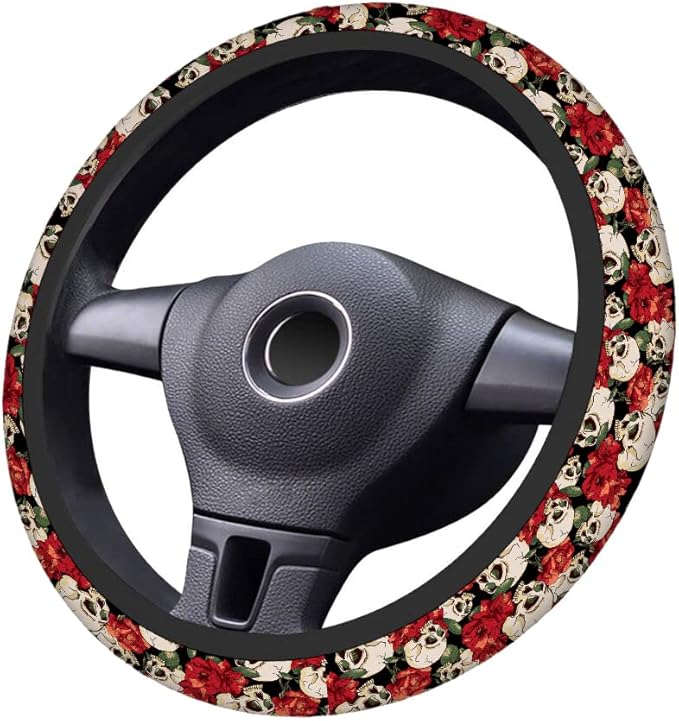 Swono Red Flower and Skull Steering Wheel Covers 15" Inch Skull and Flowers Day of The Dead Universal Fit Most Car Sedans SUVs Comfort Grip Comfortable Neoprene Breathable Steering Wheel Protector