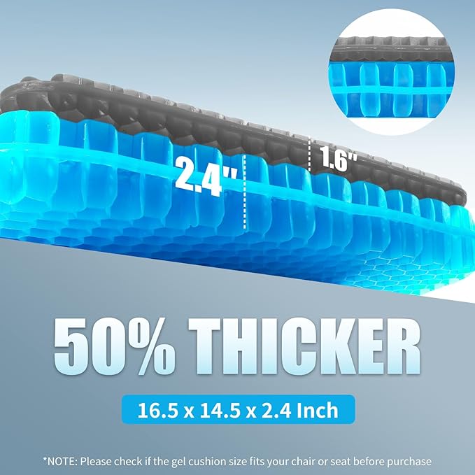 - ✔️【2.4 INCH THICKNESS】LYUANEC Thicken gel seat cushion with size of 16.5" x 14.5" x 2.4" (L x W x H), upgraded the thickeness from 1.6" to 2.4", making it 50% thicker and provide more support than other gel cushion.