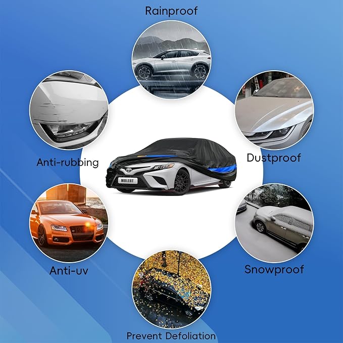 - WHAT IS THE COVER FOR? - Molebt outdoor car cover will protect your vehicle in different extreme weather. Heat protection in summer and snow ice protection in winter. In addition uv rays, sand, dust, leaves, branches, rain, frost, bird droppings etc.