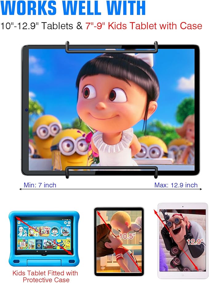 - Compatible Devices : Compatible with 10-12.9 inch Tablets/ iPad Pro Air Mini/ Fire HD Kindle/ Switch, Work with 7"- 9" Fire HD kid tablets fitted with a protective Compatible with 10-12.9 inch Tablets/ iPad Pro Air Mini/ Fire HD Kindle/ Switch, Work with 7"- 9" Fire HD kid tablets fitted with a protective