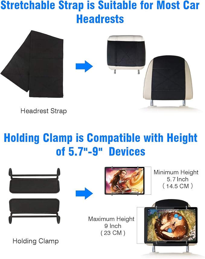 - 【Compatible with All 10-12.9inch Tablets】This universal ipad car holder boasts new Upgraded high elastic and sturdy two holding clamps, which work well with 10-12.9 inch and the thickness less than about 0.7 inches tablets or other media devices (Also supports 7"- 9" fire HD kid tablets fitted with a protective case). Adjustable headrest strap supports to install with different size car backseat headrests horizontally or vertically, which is suitable for most cars