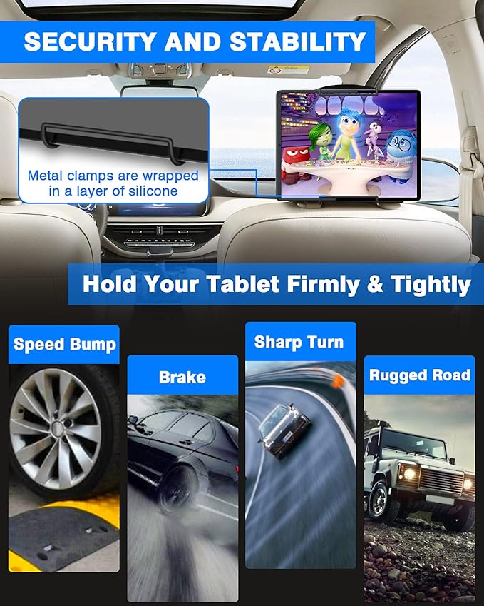 - 【Upgraded V*elcro & No Slip】We've enhanced the v*elcro surface area on the ipad holder for car, ensuring a stronger bond with the silicone holding net. Your tablet will stay firmly attached to the car headrest, even during speed bumps or rough roads. Say goodbye to worries about slips or falls—travel with confidence!
