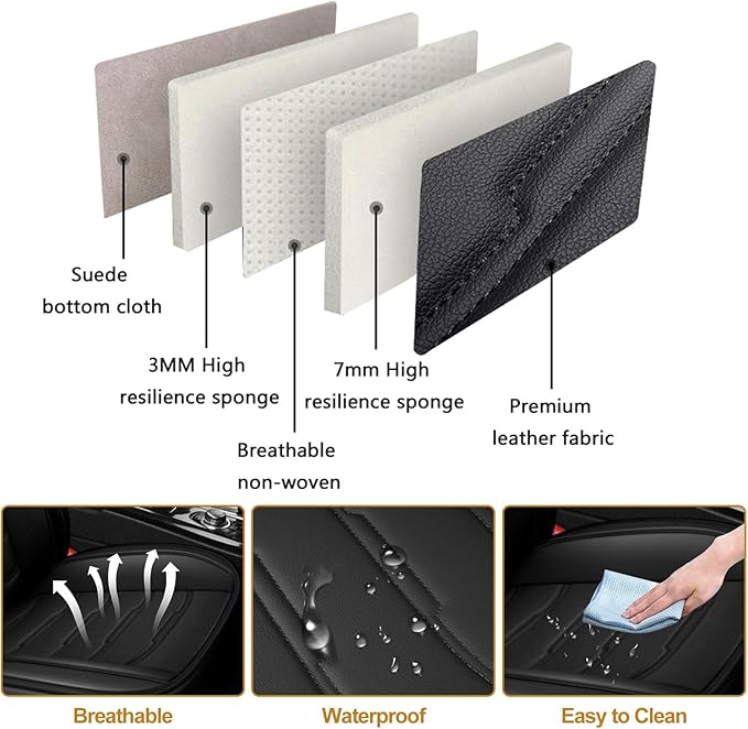 - 【Quality Material】 - OTOEZ leather seat covers are designed with five layers of thoughtfulness, the surface is made of high quality skin-friendly faux leather, and the interior is filled with high rebound sponge, making the cover soft and breathable. The bottom cloth has anti-slip silicone particles to increase friction and ensure that the seat cover will not move and slip during use.