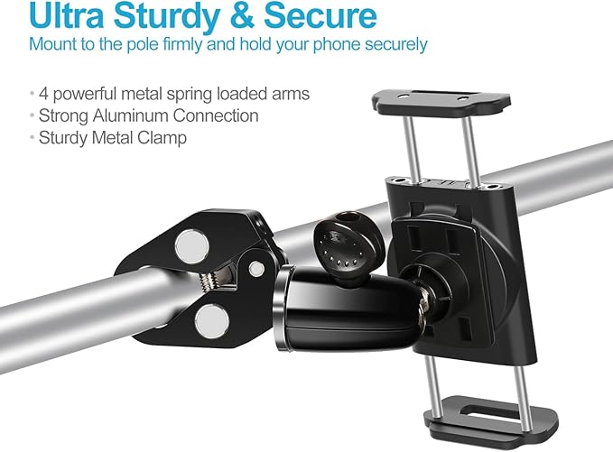 - 【Strong & Sturdy】 We adopt a new connection way and reinforce the swivel ball (metal built), so this microphone stand phone mount is more stable and secure. The pole clamp is all made of solid metal, which is reliable and sturdy enough to grab the pole firmly. Sturdy construction for easy portability and reliable performance.