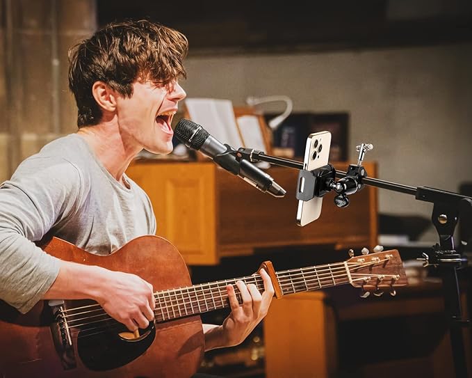 - 【No Installation Needed】 Directly attach to your boom or the upper section of the straight mic stand, just twist to lock C clamp design. No Tools required and easy to install. This mic stand phone holder is small and light weight for carry, good for playing music on stages, weddings, parties, concerts, chorus classes and Zoom Video.