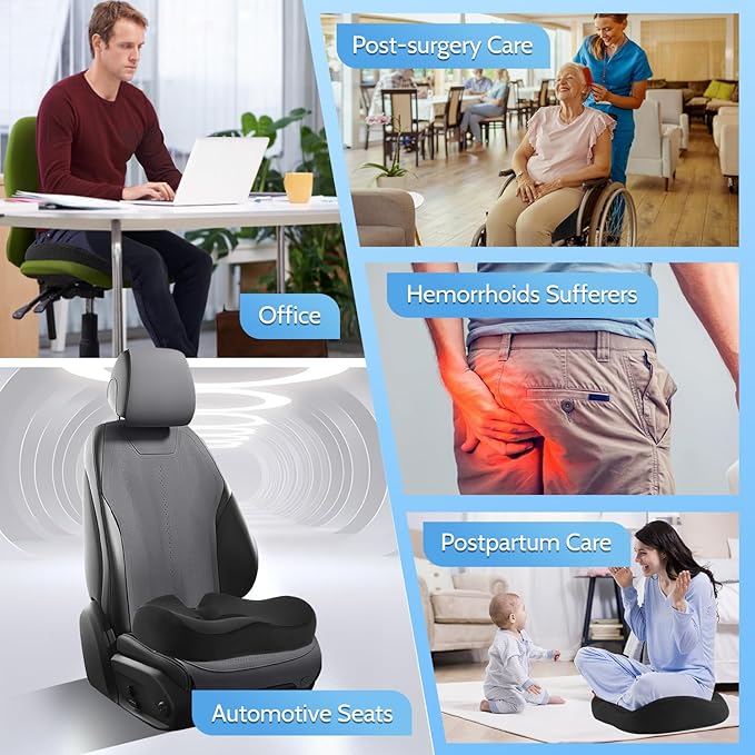 - [Innovative Design Donut Pillow] After researched the traditional donut pillow and hemorrhoid pillow, This new style donut cushion retaining the advantages of classical design in Scientific Center Hole & Coccyx Cutout, this hemorrhoid pillows for sitting seat cushion come with two humps hip curve and leg curves ergonomically designed, so it can keep donut pillows traditional functions and bring more comfortable experience when you sitting on this butt pillow, we suggest you can take this doughnut pillow as one hemorrhoid pillow, also as one coccyx cushion for tailbone pain, etc