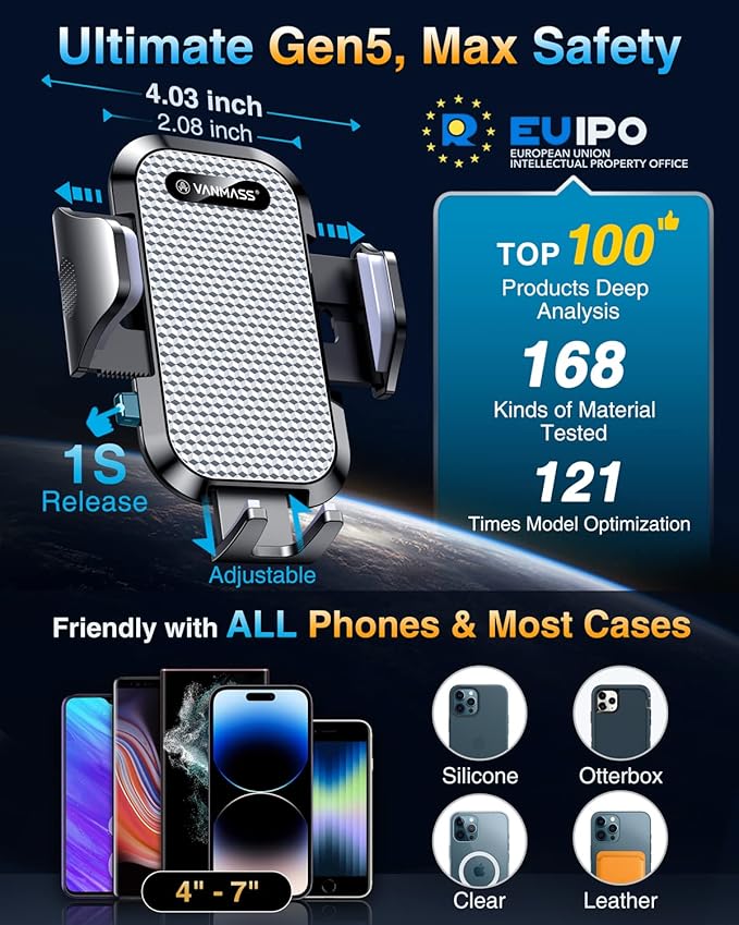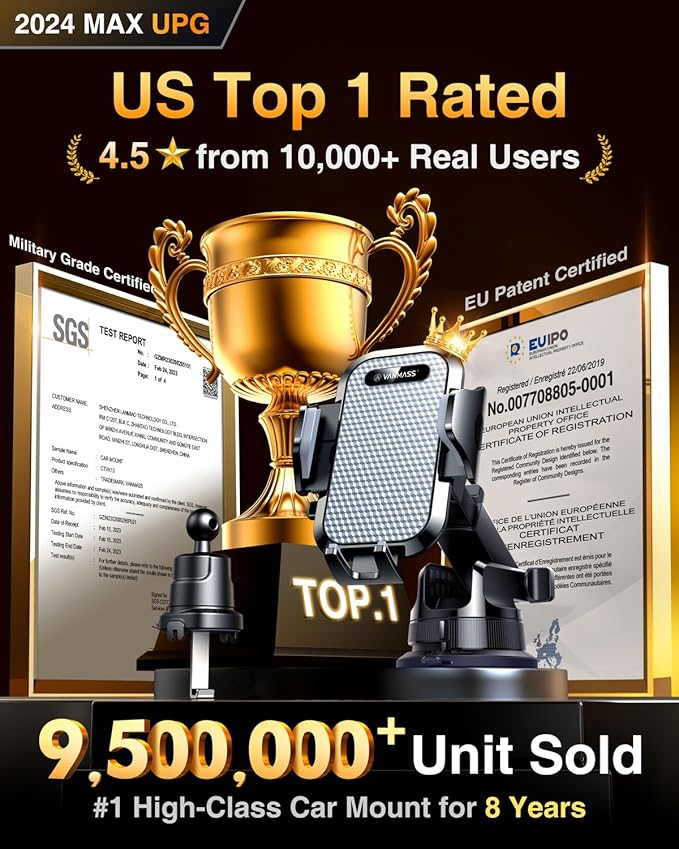 - 【True Military-Grade Certified, 2024 Upgraded Ultimate Car Mount】VANMASS, the leader in high-end car phone holder. Over the past 8 years, We have listened to the voices of millions of users, rigorously tested to MILITARY GRADE standards (stability, compatibility, flexibility, security, durability). Finally, we overcome all weaknesses to design the Ultimate Model that we are most satisfied with. This item obtained international military-grade shockproof certification No. GZMR220601855501