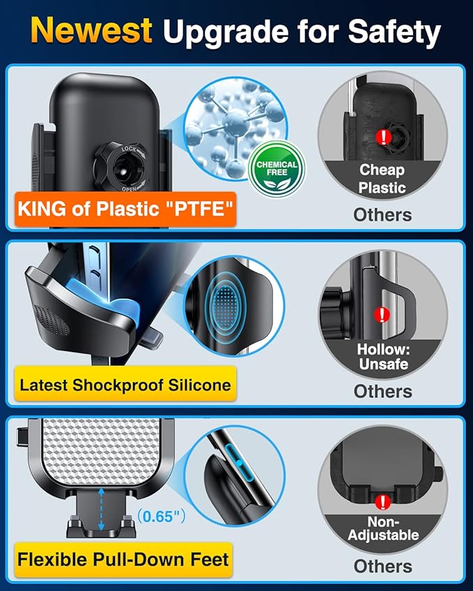 - 【Smoother "One-Click Release" & Perfect Protection】 You can easily place or remove the phone with one hand. After 7 structural reliability tests, we have upgraded the internal parts of the phone holder to improve the experience of using the"One-Click Release" function, which is smoother and more reliable. We also have used a more flexible silicone arm to hold your phone more securely and prevent it from being scratched by plastic