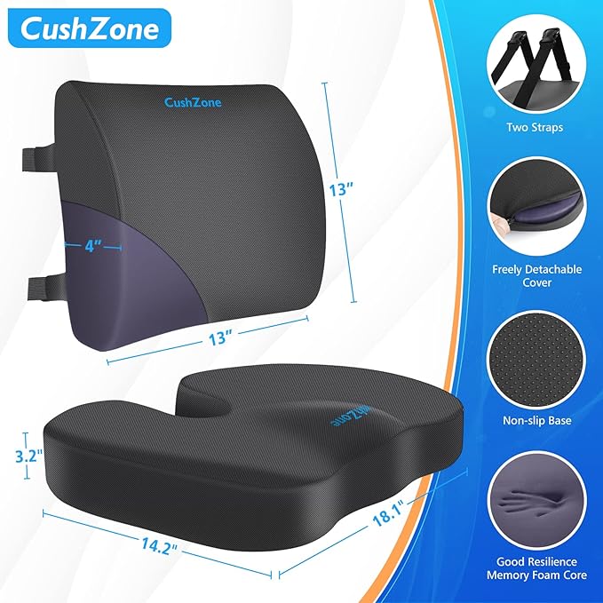 - 【Comfortable Sitting】The dimensions of the chair cushion are 18.1" x 14.2" x 3.2" and the dimensions of the lumbar support pillow are 13”x 4”x 13”. The size meets the needs of most people, and the shape of the product is ergonomically designed to effectively relieve the discomfort caused by sitting in one place for extended periods of time.