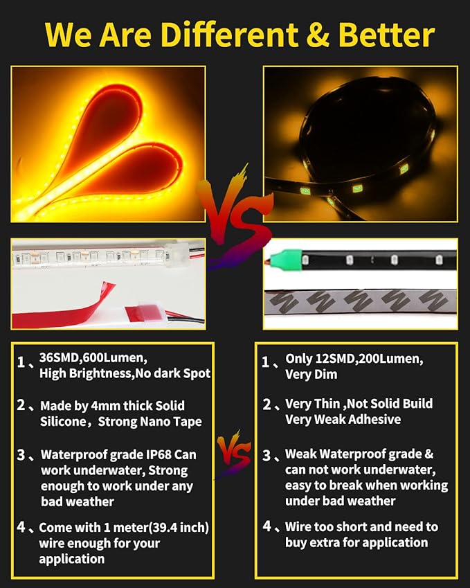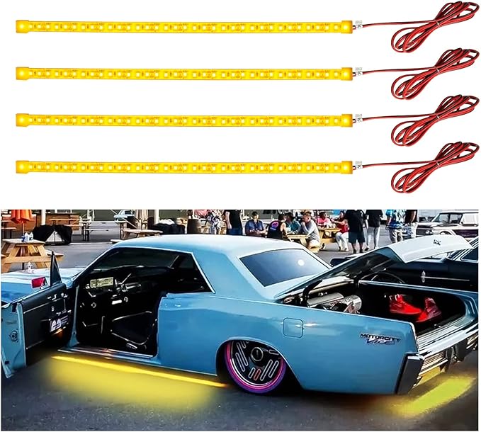 - 【WATERPROOF IP68】Amber/Yellow led strip lights exterior interior car lights,waterproof credit:IP68. Can be used interior and exterior,the atmosphere light length:30CM ( 12" ) strip light.