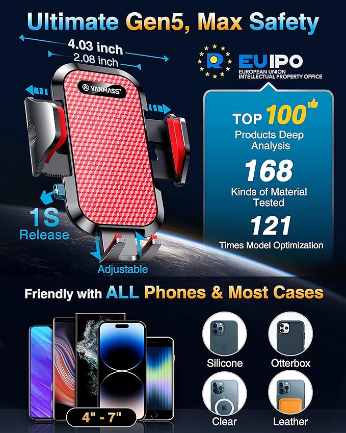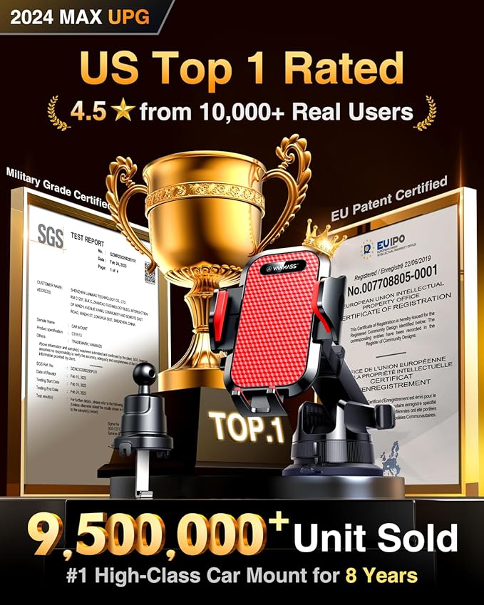 - 【True Military-Grade Certified, 2023 Ultimate Car Mount】VANMASS, the leader in high-end car phone holder. Over the past 8 years, We have listened to the voices of millions of users, rigorously tested to MILITARY GRADE standards (stability, compatibility, flexibility, security, durability). Finally, we overcome all weaknesses to design the Ultimate Model that we are most satisfied with. This item obtained international military-grade shockproof certification No. GZMR220601855501