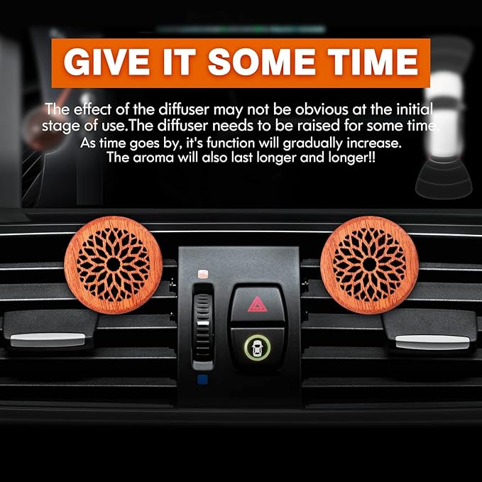 - DRIP YOUR ESSENTIAL OIL ON THE TOP: No need to Loosen the cover. Just drip 4 drops of your favorite essential oil on top of the wood and wait for the essential oil to be absorbed, then clip it on the exhaust hole of car air conditioner by the vent clip. Then you will smell the scent of your favorite essential oil in the car. Because of made of wood, when you want to tighten the lid, please do not be too hard.