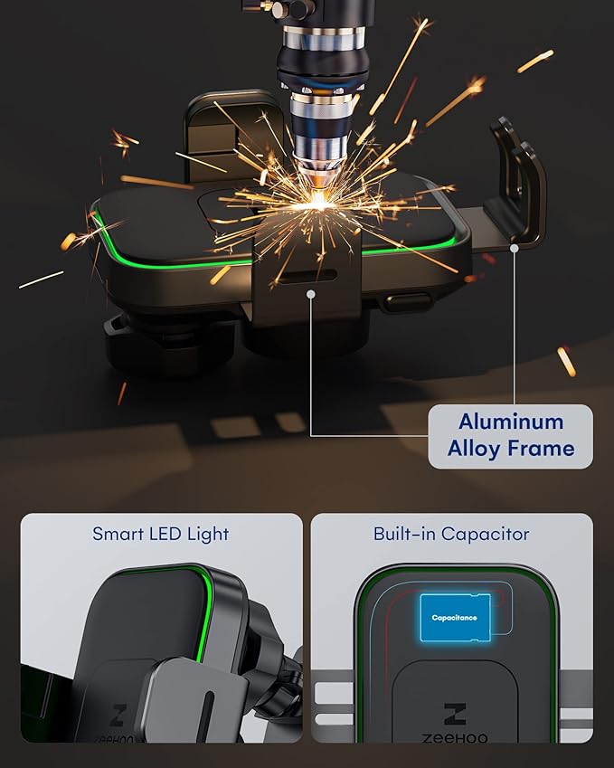 - Durable Aluminum Alloy Frame -- The bottom bracket and clamping arms of our car mount wireless charger are made of sturdy aluminum alloy for long-lasting reliability.