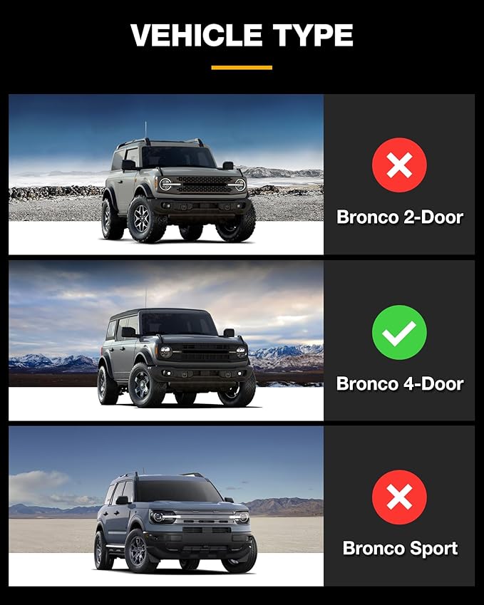 - : Vehicle Service Type 2021-2025 Ford Bronco 4-Door Crew Cab, Not for Bronco Sport & Rubberized Floor 2021-2025 Ford Bronco 4-Door Crew Cab, Not for Bronco Sport & Rubberized Floor See more