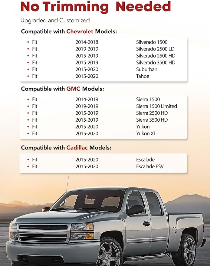 - Custom Fit to Your Vehicle: Replacement for Chevy Silverado/Sierra 1500 2014-2018, 2015-2019 Silverado/Sierra 2500/3500 HD, for 2015-2020 Cadillac Escalade/Chevy Suburban/Tahoe/GMC Yukon; YHTAUTO's floor mats fit precisely with the original car, compared with universal car mats, there are no cropping required the mats, directly lay on the foot mats can enjoy the comfortable driving experience