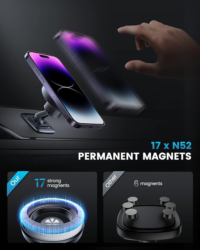 - Innovative Magnetic Design: With 17 N52 magnets and a metal ring, this magnetic car phone holder boasts a strong magnetic suction and stability. For non-iPhone series, the metal ring must be used