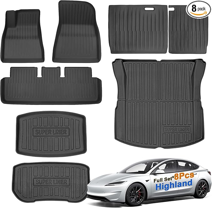 SUPER LINER Tesla Model 3 Floor Mats 2025 2026 2024 | Custom Fit All-Weather 8-Piece Set TPE Material | Tesla Model 3 Highland Floor Mats&Back Seat Protector&Cargo Liner, Trunk&Interior Accessories