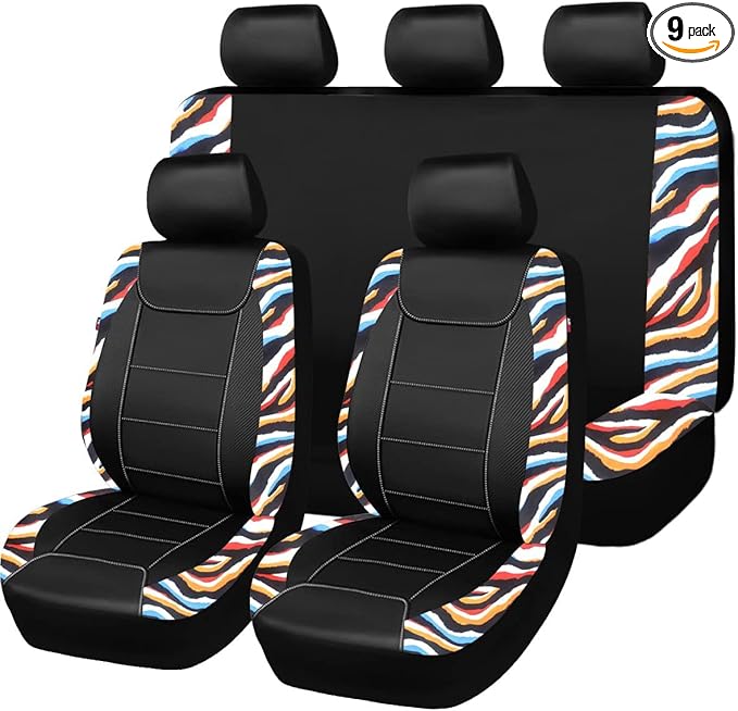 Flying Banner car seat Covers Protects Water Proof Faux Leather Carbon Fiber Fronts Rear Bench Covers (Muti-Color Zebra Black, Full Set - 8PCS)