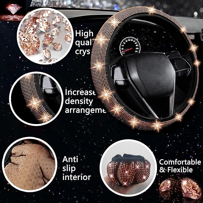 NBTEPEM 27 PCs Gold Champagne Bling Car Accessories Set for Women, Steering Wheel Covers Universal Fit 15 Inch, Bling License Plate Frame, Bling Phone Holder, Bling Car Coasters