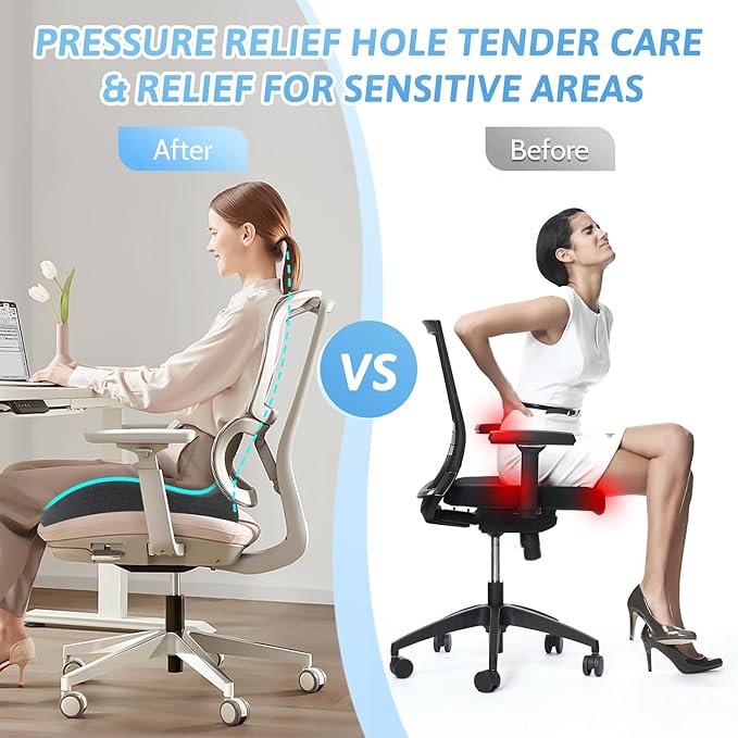 - [CREATIVE DESIGN DONUT PILLOW]* This seat cushion for tailbone pain relief, can use as seat cushions for office chairs. This donut pillow provides your hips,tailbone and legs comfortable support. This is one seat cushion for tailbone pain relief, specially suitable for anus disease people, long time sitting people, long travel sitting people, also use for donut pillow postpartum pregnancy etc,