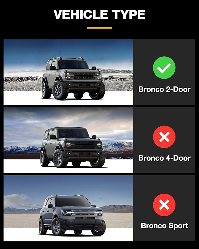 - : Vehicle Service Type 2021 2022 2023 2024 2025 Ford Bronco 2 Door Base/Big Bend/Black Diamond/Outer Banks/Badlands/Wildtrak/First Ediyion, NOT for Bronco Sport & Bronco 4 Door & Rubberized Floor 2021 2022 2023 2024 2025 Ford Bronco 2 Door Base/Big Bend/Black Diamond/Outer Banks/Badlands/Wild… See more