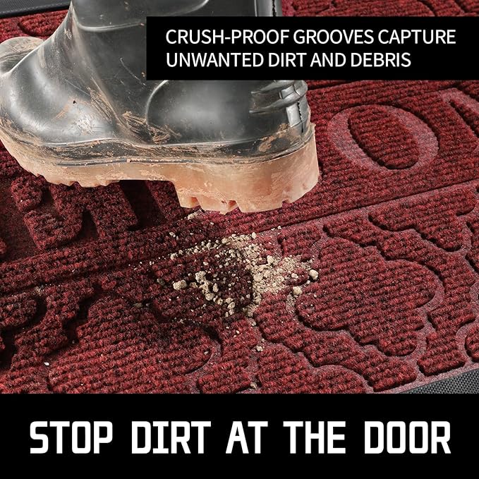 - 【Groove Pattern Design】:The surface of the christmas door mat features a distinctive groove pattern with the "WELCOME" lettering, making it unique and eye-catching. It instantly adds a friendly and warm touch to your doorstep.The outdoor door mat features environmentally friendly polypropylene material with a patterned groove design that effectively captures and retains dirt, dust, and sand of the sole