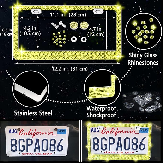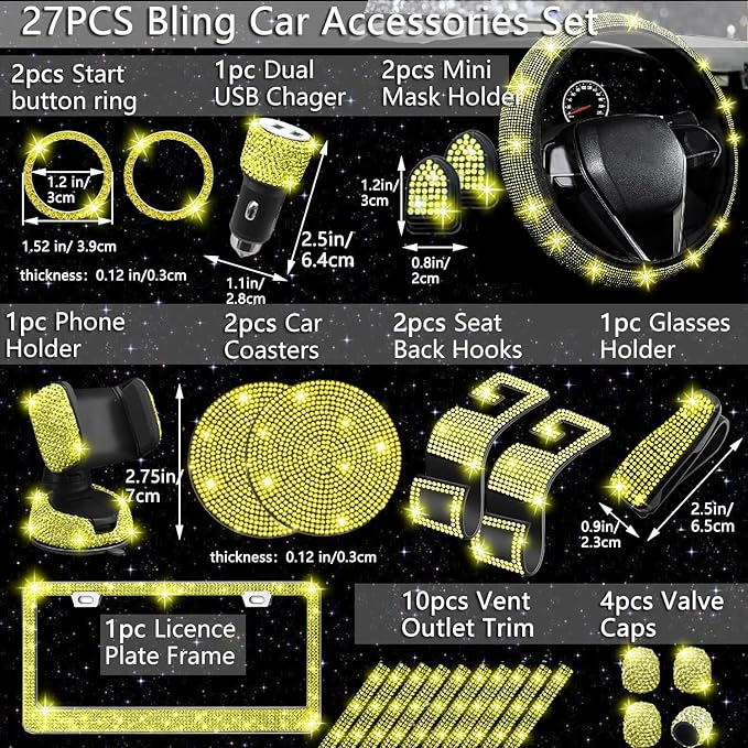 NBTEPEM 27 PCs Yellow Bling Car Accessories Set for Women, Steering Wheel Covers Universal Fit 15 Inch, Bling License Plate Frame, Bling Phone Holder, Bling Car Coasters (Yellow Diamond)