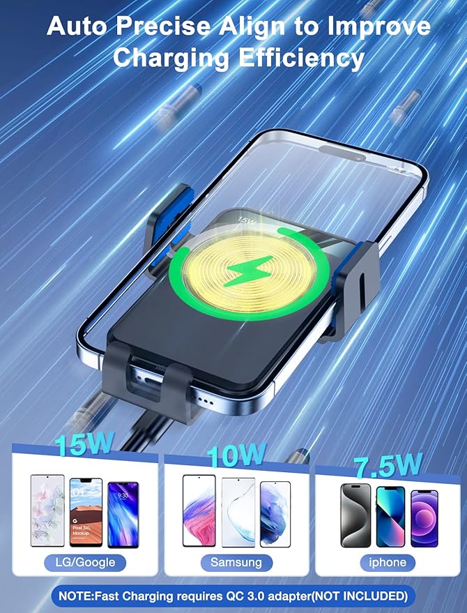 - 【Wireless Car Charger】15W Wireless Fast Charging for LG V50/V40/V30/G8/G7; 10W for Samsung Galaxy S23 Ultra/S23+/S23/S22 Ultra/S22/S21/S20/Note 20/Note 10+/Note 10; 7.5W for iPhone 16 15/14/14 plus/14 pro/14 pro max/13/13 Pro/12 Pro Max/12 Pro/12/11 /11 Pro /11 Pro Max /SE /XS /X/XR/8 Plus/8; Note: 15W/10W/7.5W Fast Charging requires QC 3.0 car charger (NOT INCLUDED), 5W standard wireless charging for other wireless charging Phones (5V/2A adapter is required).