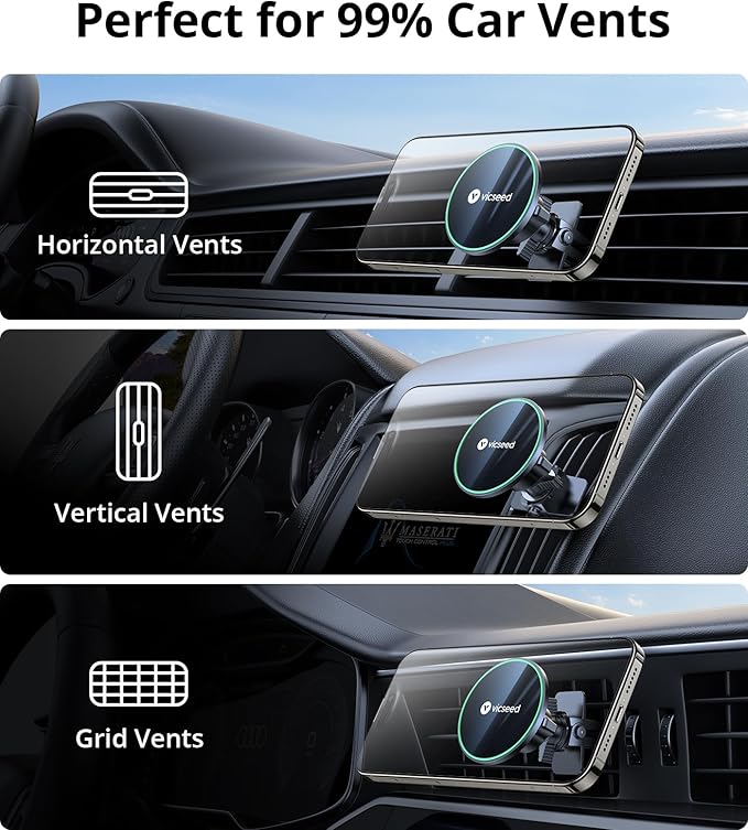 - [Ultimate Air Vent Clip] Compared with other vent clips on the market, VICSEED MagSafe car mount's vent clip stands out. ①Most Stable: Coming with the latest improved “Anti-move baffle + Double lock mechanism + built-in metal" - [Won't Fall Off/Broken] ②Most Universal: Adjustable opening makes this cell phone holder car vent fit for 99% vents ③Most Safe: The soft silicone on the vent clip can hold the vent phone mount for car more stably and protect vent blade from being scratched or deform