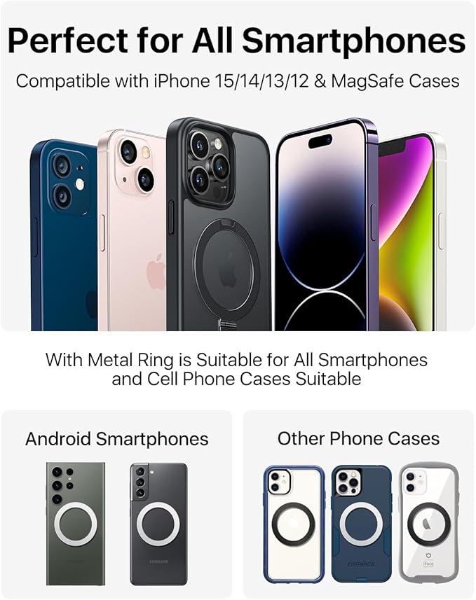 - [Perfect for All Smartphones] It is designed specifically to work with the magsafe technology found in newer iPhone models and keeps your iPhone 17/16/15/14/13/12 Series phones and any mobile phones with a magsafe case in place for an experience. (Using the included magnetic metal ring, android phones can also be magnetically adsorbed)